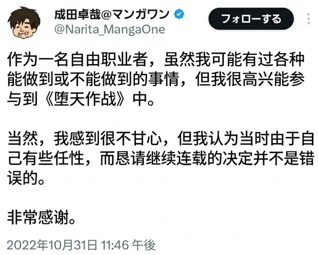 成田卓哉后来还在推特表达自己对没能保住《堕天作战》很不甘心