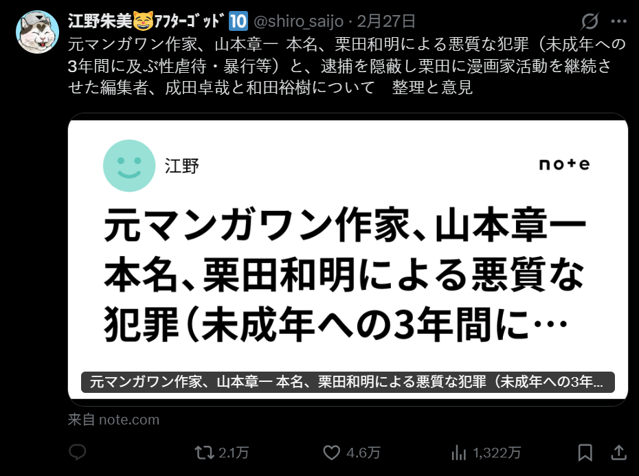 正是这篇检举文章,才真正将山本章一及Manga One编辑部还有背后的小学馆推上了风口浪尖。