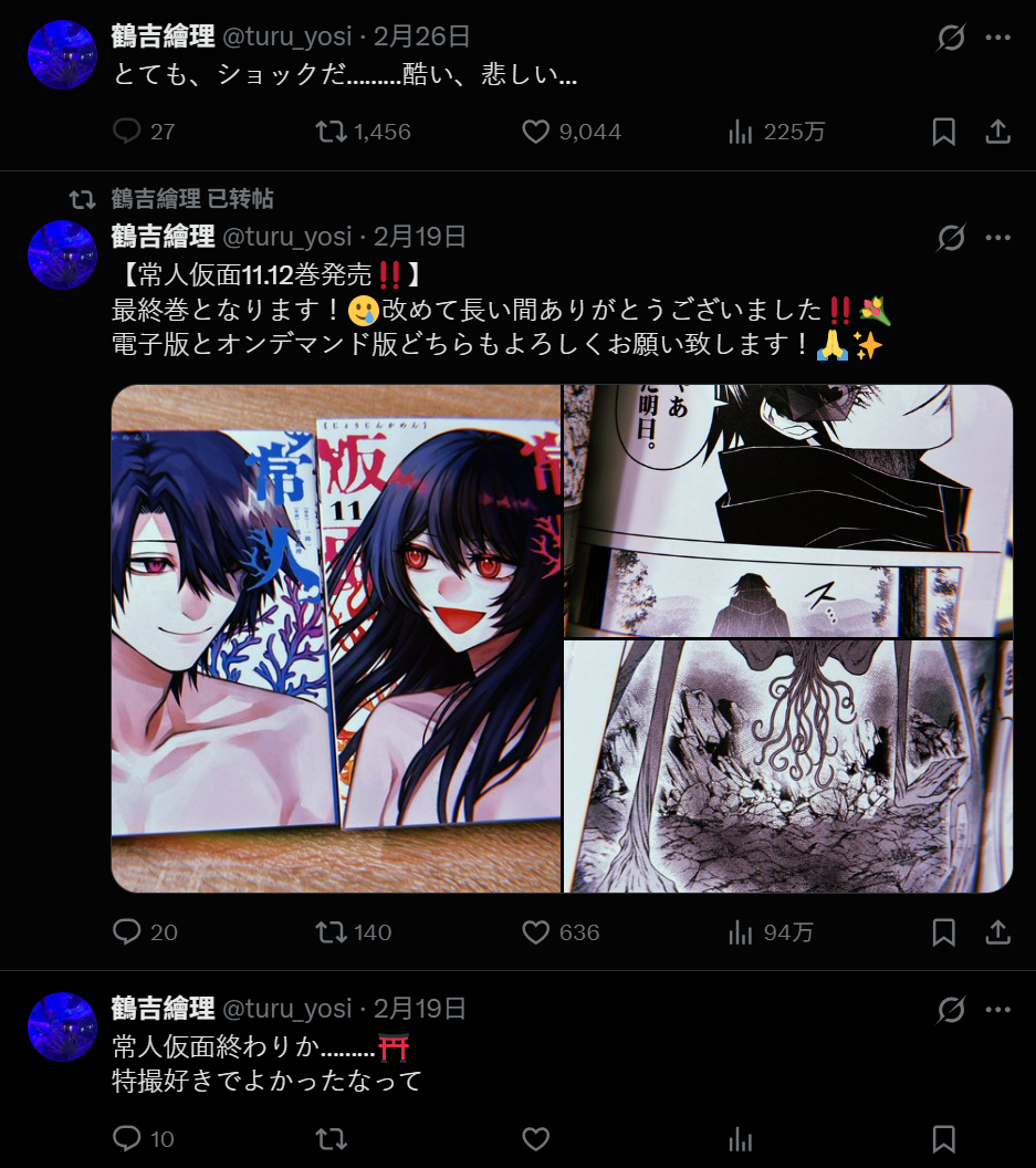 “对于一直以来支持《常人假面》的各位读者,尽管得到了大家的支持,却还是发生了这样的事情,我由衷地向大家表示歉意。”——鹤吉绘理