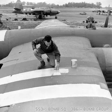 诺曼底登陆前,一名地勤给美军B-26轰炸机涂刷入侵条纹