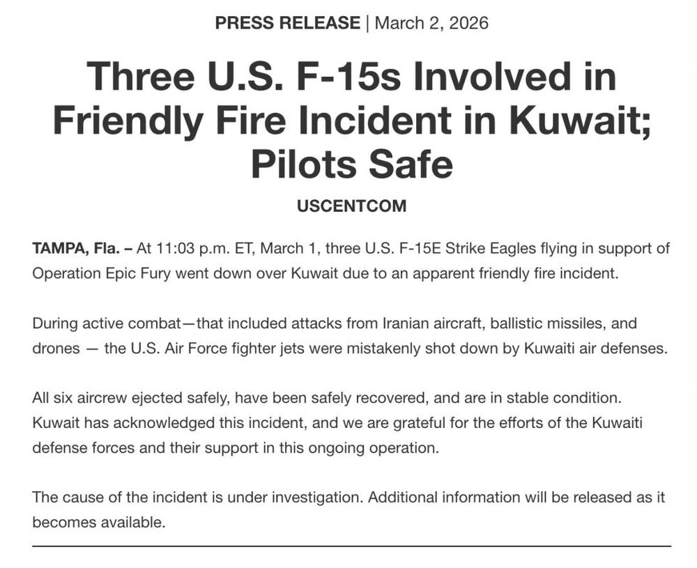 伊朗军方很快发布消息宣称击落一架美军飞机。然而,反转来的很快,美军中央司令部很快官宣,不是一架,而是三架F-15E被击落!击落它们的导弹,并不来自伊朗,而是来自美国的友军科威特的防空部队,而且就是美制装备爱国者防空导弹。