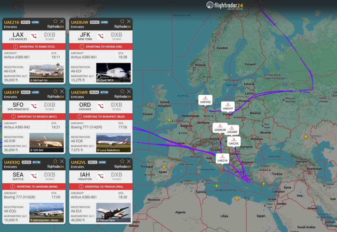 而且需要注意的是,受影响的不仅仅是抵离中东的航线,一些途径欧亚的航线也受到影响不得不折返返航,这是因为起飞前制定的飞行计划与油量并没有考虑到绕飞中东这一因素。而由于战争爆发过于突然,大量以中东为目的地的飞机飞到一半才接到战争爆发的通知,随后立即折返或者就近备降。其中阿联酋航空机队主要为空客A380与与波音777这种大型机,对于降落机场跑道要求极高,因此能选择的备降机场基本也就那几个枢纽机场。