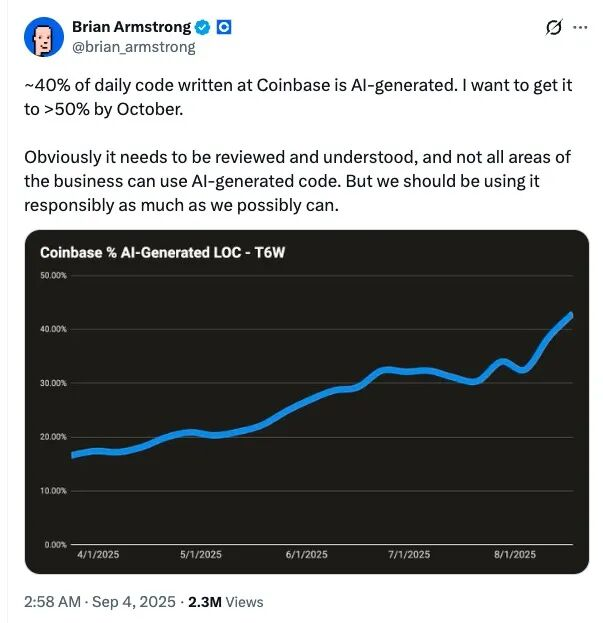 一个月后,Armstrong的激进又达到了新的程度:他在X上公开表示,Coinbase目前约40%的日常代码已经由AI生成,而他的目标是在30天内把这个比例推到50%以上。