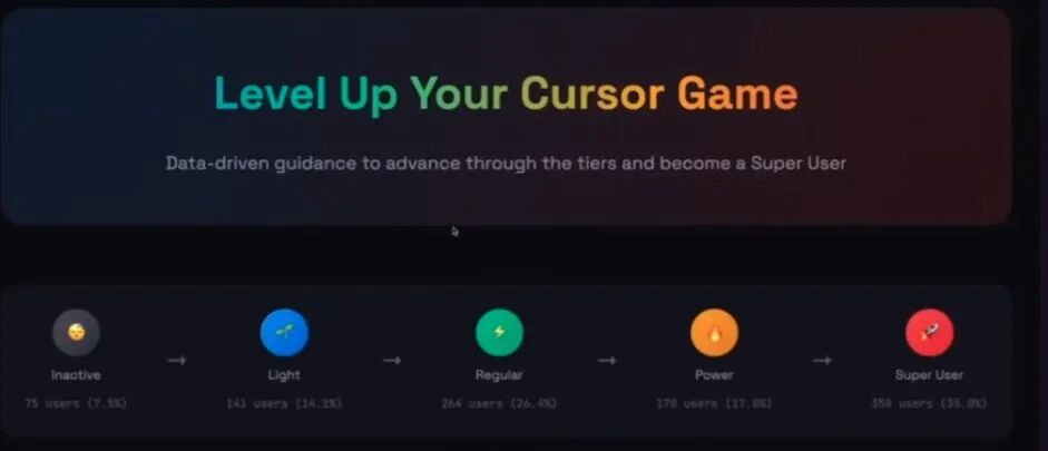 我把Cursor管理后台导出的CSV丢进去,让它帮我做两件事:一是按使用方式把团队自然分群,二是把结果做成我能复用的输出(比如CSV汇总、简单的dashboard,顺便生成一份Python脚本)。它会按大致的使用强度把人分成light、moderate、active、power、super user,也会看一些更细的维度:产出量、使用复杂度、是否常用agent mode、模型偏好、采纳率,以及到底用了哪些功能。