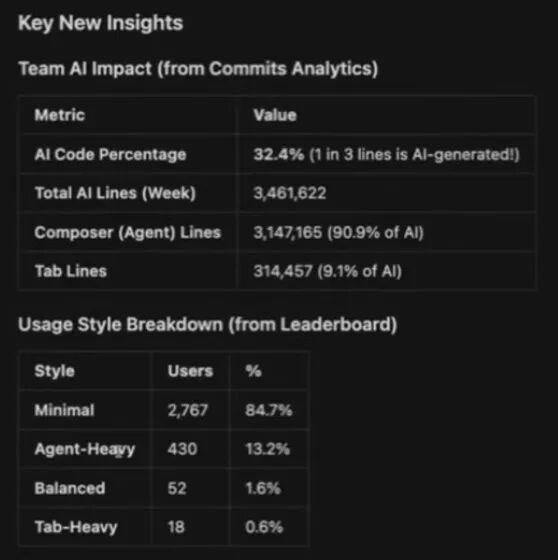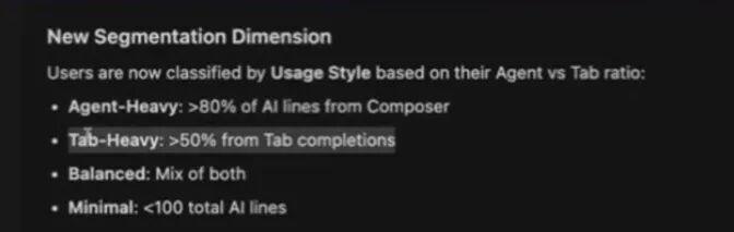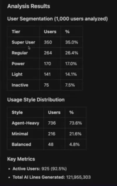 跑完后,它给了我一些高层指标(比如AI生成占比、每周AI行数、agent/composer生成行数、tab补全行数),更重要的是它做出了更“行为导向”的分群:一类是agent-heavy,很多任务直接交给agent;一类是tab-heavy,主要靠tab补全,更偏“自己掌控”;还有balanced,两边都用;以及cursor curious——装了但用得少、还在观望、还没真正进入“LLM工作流”的人。