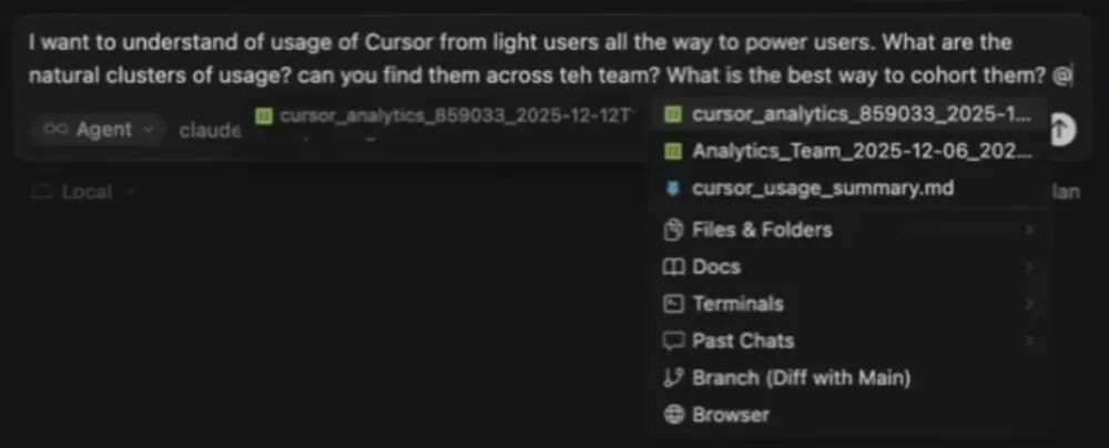 我一开始很简单:我想理解Cursor的使用情况。我已经知道团队里从轻度用户到重度用户都有。我特别想搞清楚的是:使用行为有没有天然的“聚类”?能不能在团队里找出这些群体?怎么做分组(cohort)最合理?我就把这个标准analytics文件丢进来,用Curosr进行分析。