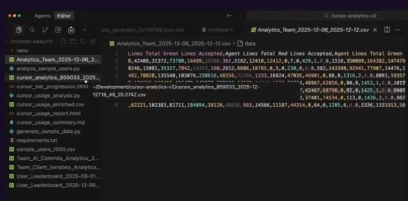 Cursor的数据分析能力其实很强——你进admin面板看analytics,而且它还允许你把数据下载成CSV。我就想:能不能干脆用Cursor来分析团队到底怎么用Cursor?但不是那种虚荣指标式的统计,比如“AI提交了多少行代码”。我觉得那其实挺误导的。更重要的是深挖:他们到底怎么用、怎么把“高手用法”复制出来。