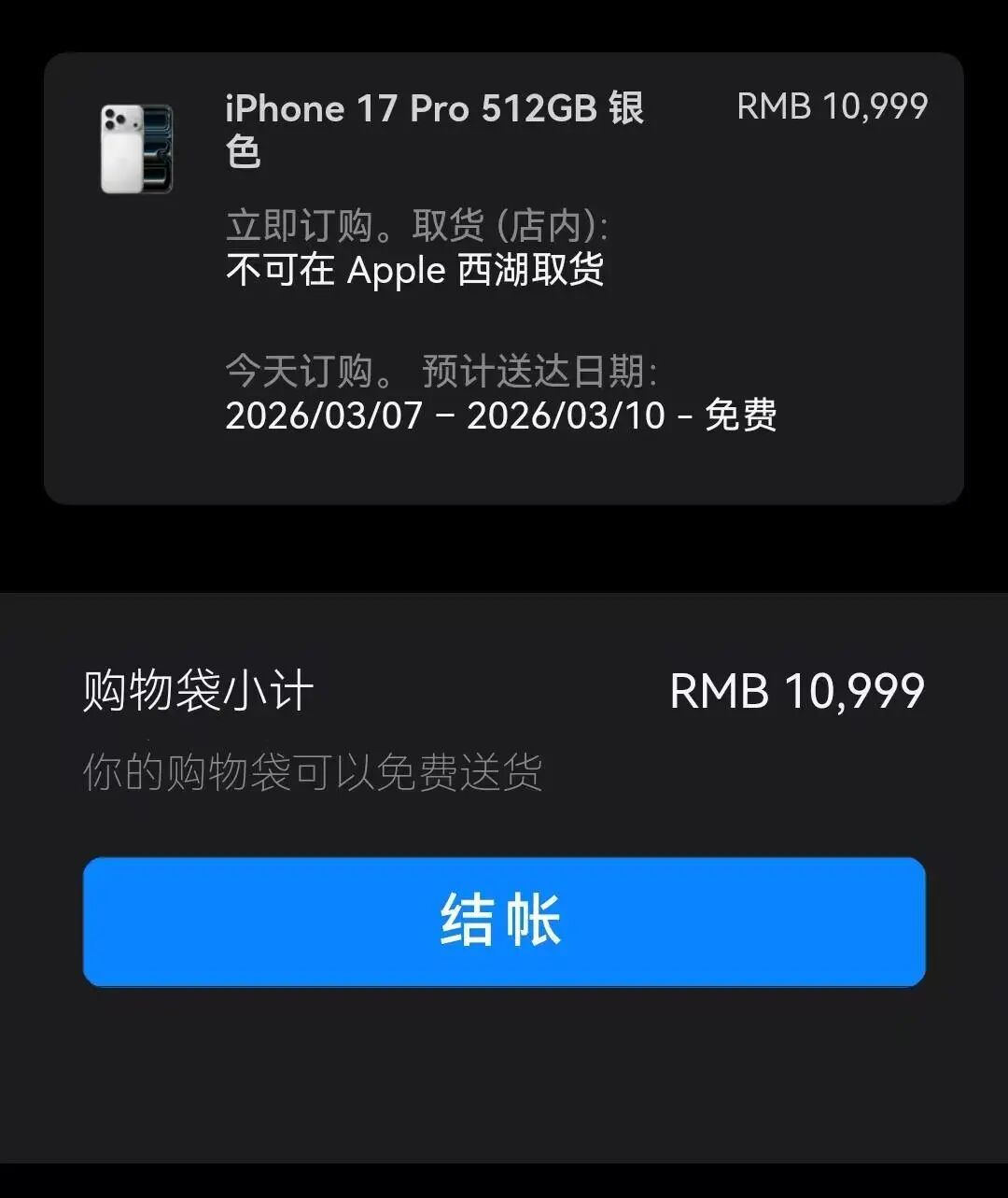 在苹果官网,记者看到,原先2-3天就能收到货的iphone17pro,现在下单需要一周时间才能拿到,且不支持门店自提。也就是说,需要现货的消费者只能去经销商处购买。