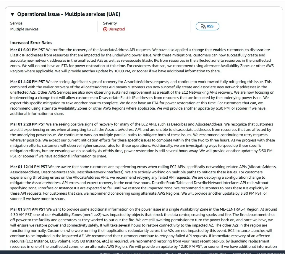 图:AWS官方状态页的事故通告:阿联酋(UAE)区域(ME-CENTRAL-1)某个可用区因供电事故(数据中心被异物击中引发火花/起火,消防切断电力)导致多项服务与EC2网络相关API错误率升高、服务受影响。
