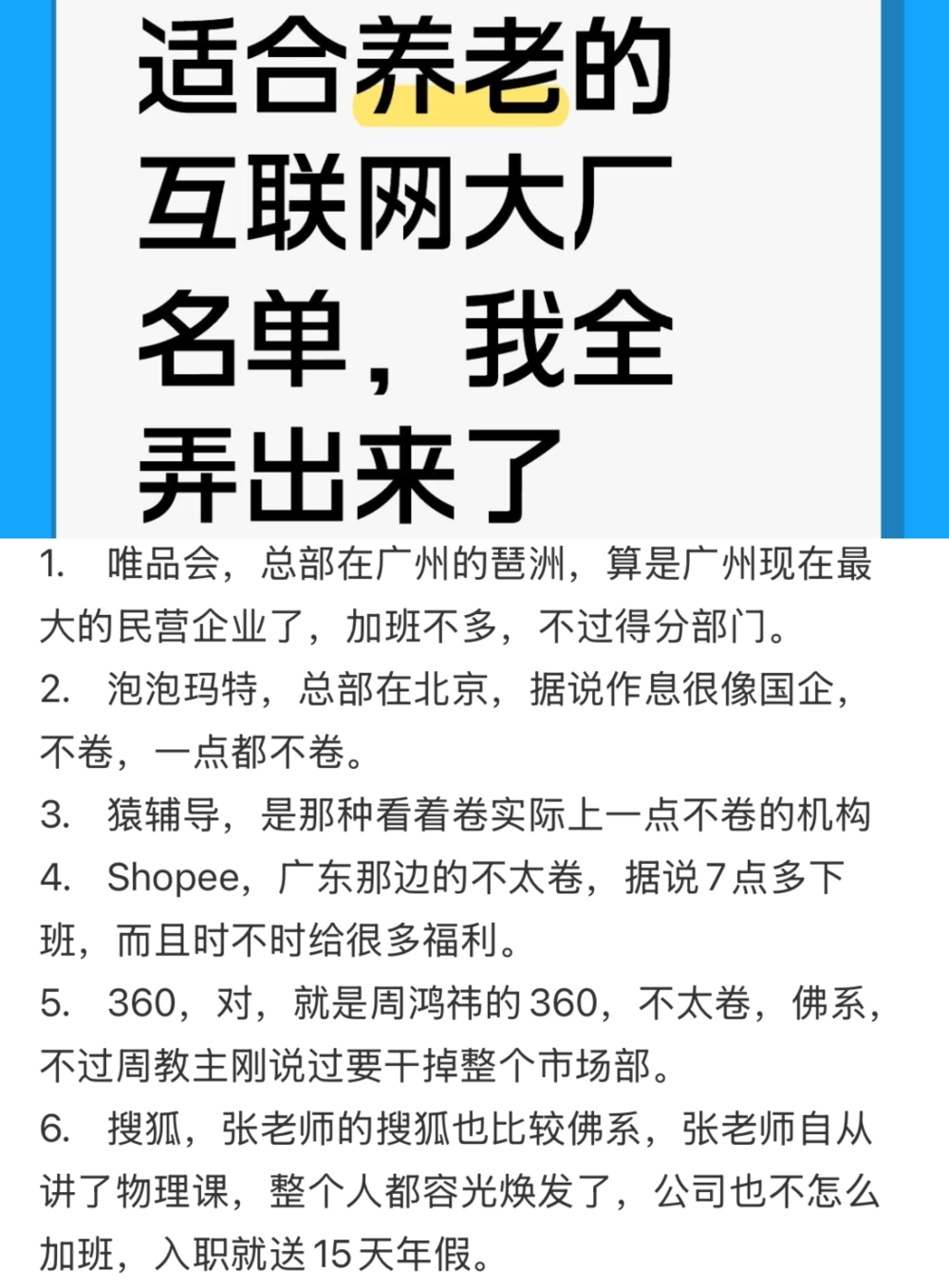 “搜狐联想百度,三足鼎立:入职即享15天年假、加班会被领导批评、上下班不打卡。尤其搜狐,人称‘互联网国企分院’。”