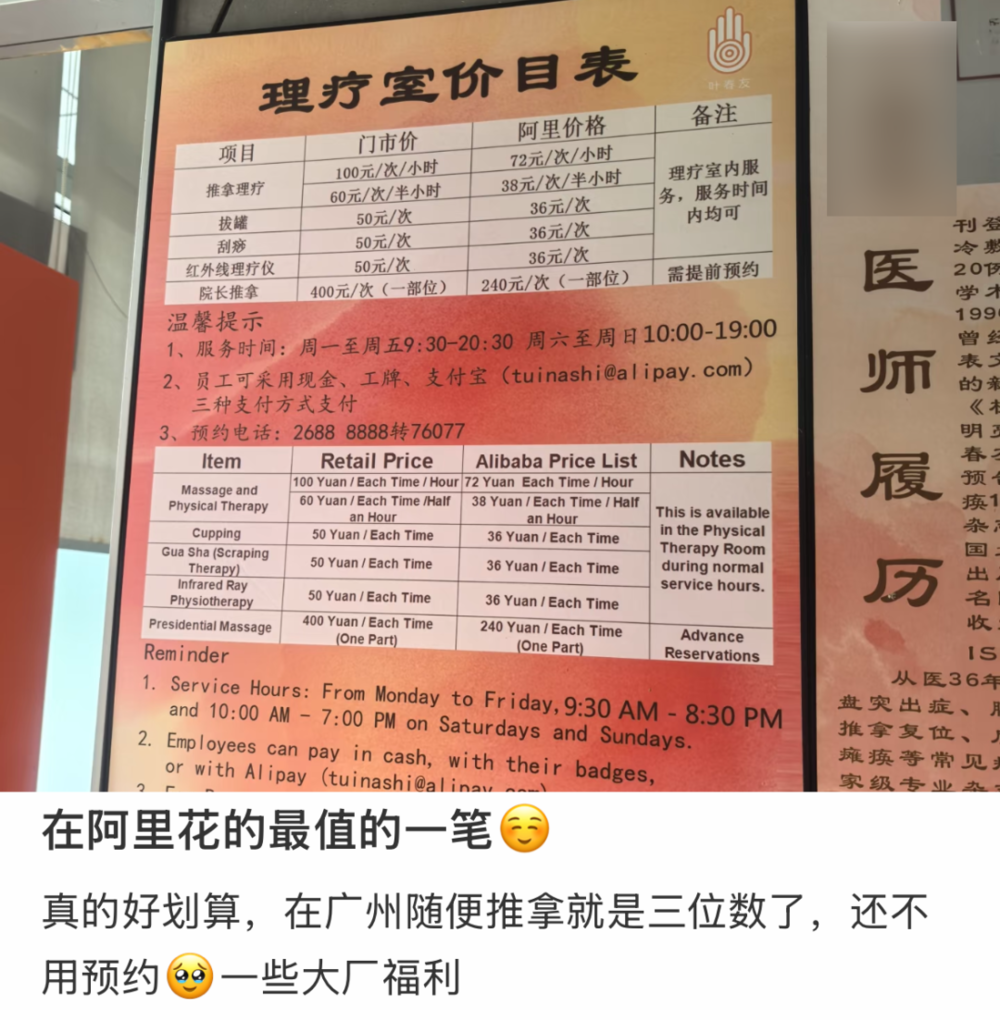 你还听说,公立医院义诊,总选在属性相似的体制内单位,为员工们免费把脉针灸;而大厂园区里,也建出了自己的spa、按摩、理疗室,依旧是员工打折价、结账能刷工牌。“项目推进高峰期的时候,一分钱不花的理疗服务,甚至能直达工位和会议室。”