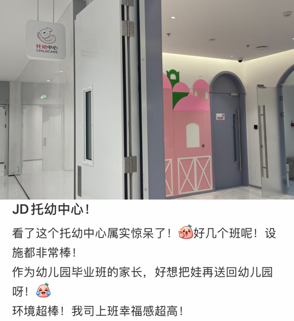 现在京东楼下直接开出个托幼中心,管饭管玩管教育。“据说亦庄的京东青年城里,还正在建幼儿园,简直是大厂版模拟人生。”