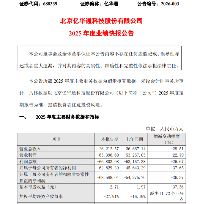 2月27日晚间,“氢能第一股”亿华通发布2025年业绩快报,公司实现营业收入2.62亿元,同比下降28.51%;归母净利润亏损6.28亿元,同比下降37.65%,较2024年增亏1.72亿元。