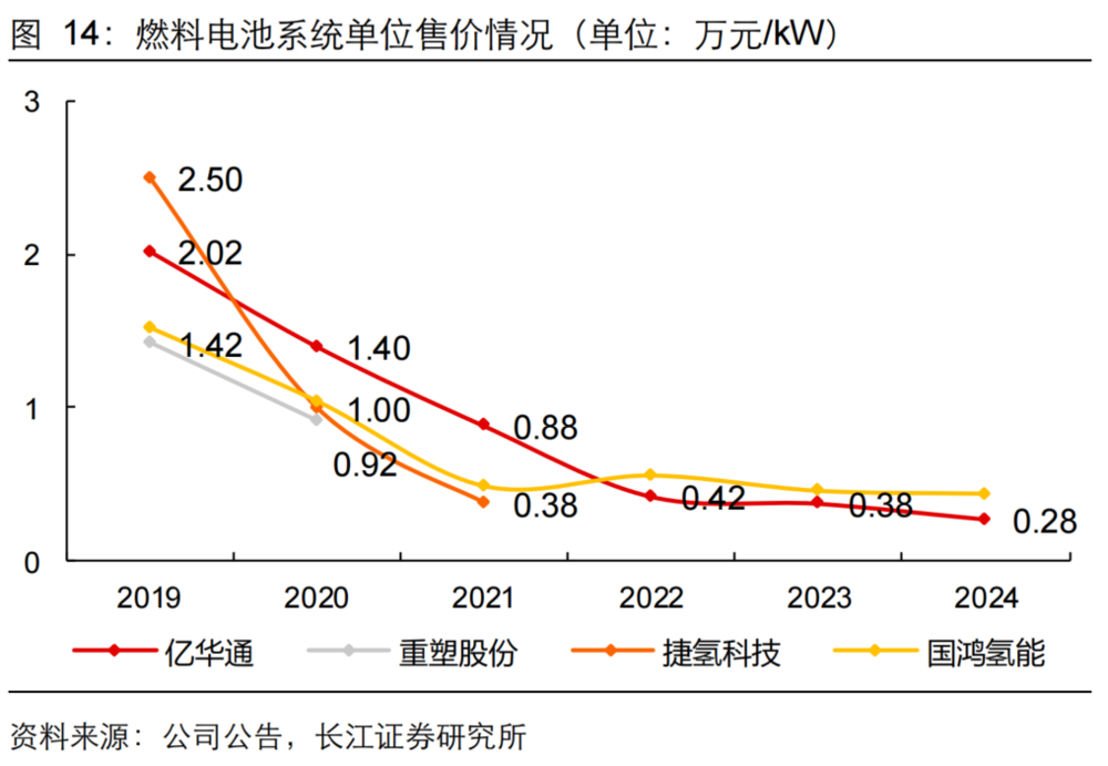 此外,从价格看,市场竞争加剧也正在导致产品价格持续承压。长江证券研报数据显示,亿华通燃料电池系统售价由2019年的2.02万元/kW降至2024年的0.28万元/kW,同比降幅27.0%,近3年复合年降幅32.2%。