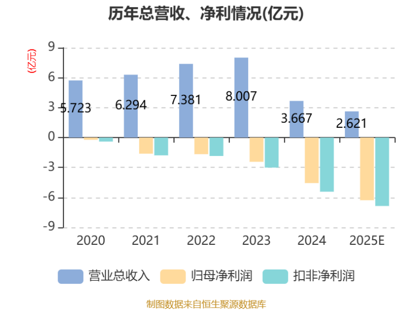 2020—2024年,公司分别亏损0.23亿元、1.62亿元、1.66亿元、2.43亿元、4.56亿元,5年累计亏损超10.5亿元。加上2025年的6.28亿元亏损,6年累计亏损近17亿元。