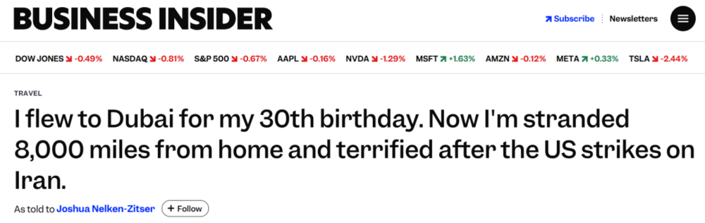 3月2号,Bussness insider发了一位美国造型师自述的故事:和朋友去迪拜旅游庆祝30岁生日,就在快要离开时突然因为美国对伊朗发动军事打击,被困在了迪拜。