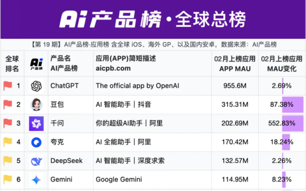 AI 产品榜发布的全球 AI 应用最新数据显示,MAU(月活用户数) 排名前三的 AI 应用分别为 ChatGPT、豆包和千问,其中,千问以 2.03 亿 MAU 成为全球第三大 AI 应用,并以 552% 的增速居全球第一。