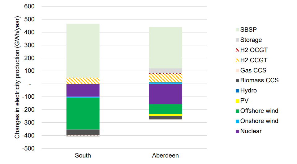 如果接收天线安置在英格兰南部,小规模太空太阳能发电(SBSP)可以替代更多的海上风电容量,而阿伯丁的接收天线主要会取代核电发电。