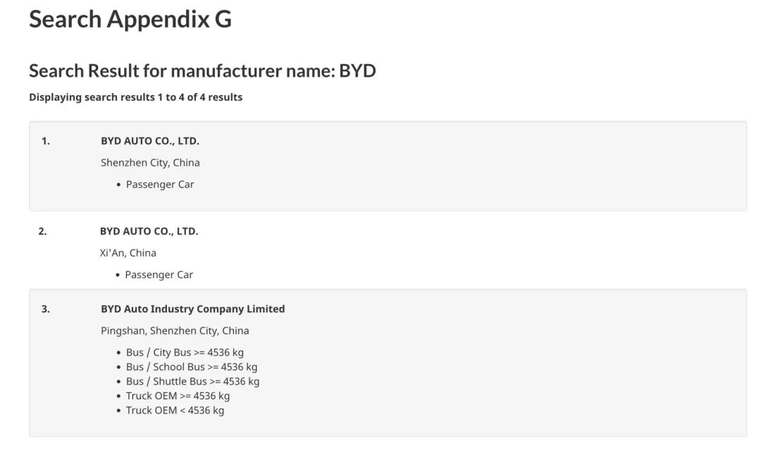 实际上,在关税政策剧烈波动之前,部分中国车企已提前完成了合规布局。《每日经济新闻》记者在加拿大交通部的Appendix G系统中查询到,比亚迪汽车已经登记在案。系统信息显示,比亚迪由深圳和西安制造的乘用车被列为拟出口加拿大的车型来源。