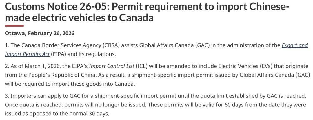 中加汽车合作迎来关键一步。日前,加拿大全球事务部(Global Affairs Canada)发布进口管制公告称,2026年3月1日至8月31日期间,将按照“先到先得”原则发放最多2.45万辆针对中国产电动车辆的进口许可,获批车辆将适用6.1%的最惠国关税税率。
