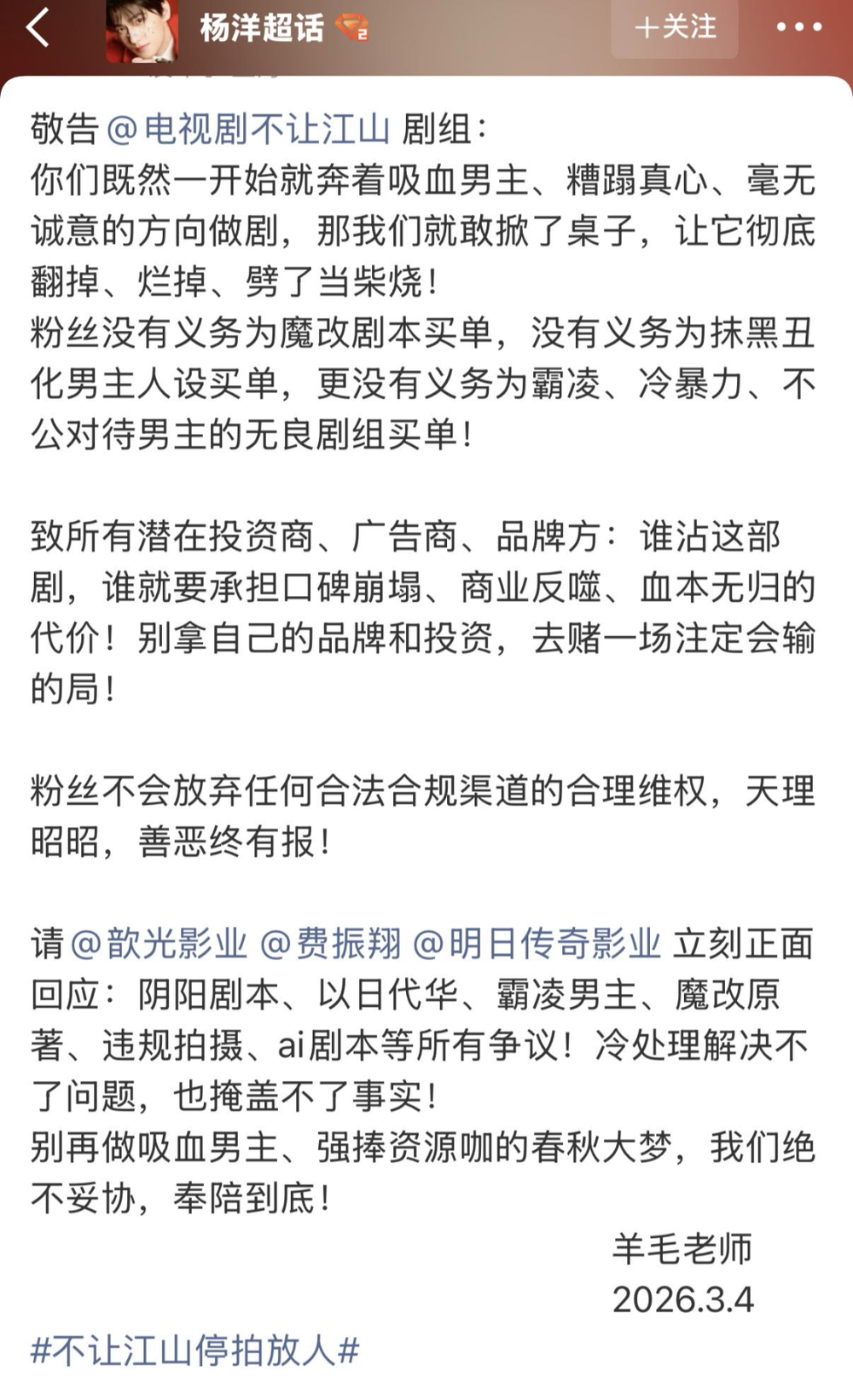 《不让江山》的风波以杨洋的一条“安抚”微博暂时平息,但这绝对不会是粉丝为偶像“维权”的最后一役。