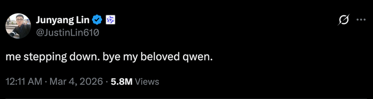 3月4日,作为阿里Qwen的开源负责人及模型的核心开发者,同时也是技术社区影响力巨大的中国AI模型厂研究员林俊旸突然发了一条推文,称自己正在离开Qwen。