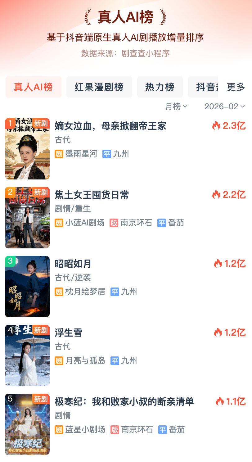 而在更加垂直的短剧平台上,爆款AI短剧已经走上C位,用极速增长的播放量验证自身流量。例如2025年12月上线的《斩仙台AI真人版》,只用两天就登顶红果漫剧热播榜,六天播放量破亿。而在今年2月才上新的AI仿真人短剧《嫡女泣血,母亲掀翻帝王家》,截至2月28日累计播放量已达2.3亿,并且成功登顶DataEye“真人AI榜”。