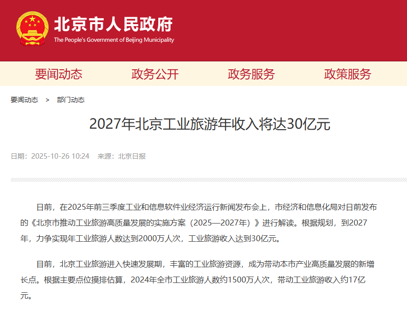去年10月,北京发布了一份关于推动工业旅游高质量发展的实施方案,时间表划到了2027年。