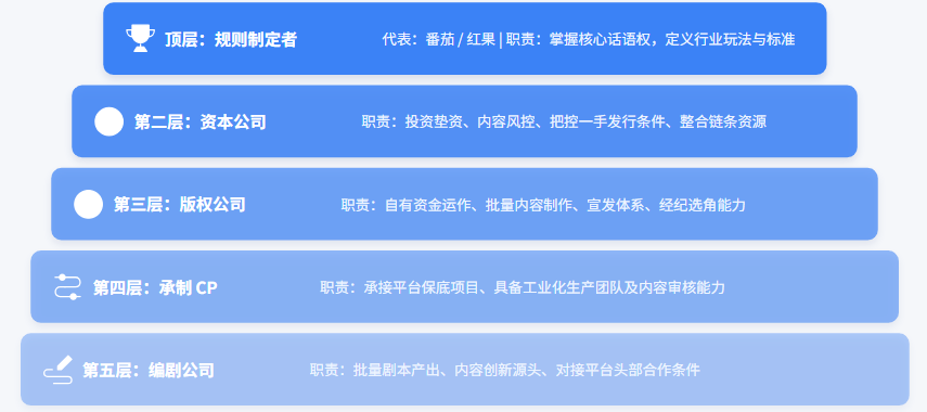第二件事儿他告诉我,短剧行业阶层还是极其森严的,纯干活的全是底层牛马。最顶端是番茄、红果这种制定游戏规则的平台。往下是带资进组、管发行的资本方。再往下是版权公司和承制方。最底层才是那些苦哈哈搞线下拍摄的导演和后期——牛马。