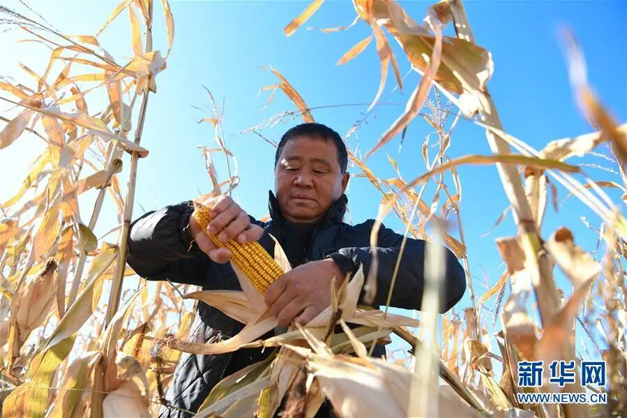 2019年10月12日,黑龙江省绥棱县靠山村党总支第一书记、驻村扶贫工作队队长陈华在田间查看将要收获的玉米。资料图:新华社