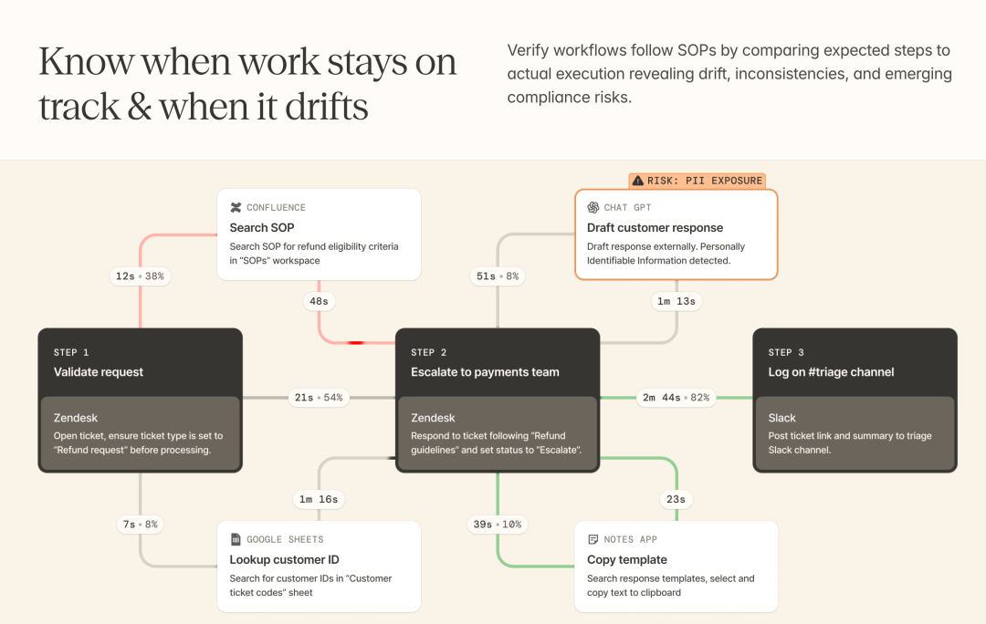这种可见性的缺失带来了真实的运营风险。领导者无法验证团队的实际产能,无法确保标准操作规程得到执行,无法识别自动化机会,也无法衡量AI和自动化投入是否真的有效。在AI驱动的世界里,这种可见性缺失会成为致命的阻碍。因为自动化的前提是理解人类的工作方式。如果你不知道工作实际上是如何完成的,你怎么可能知道该自动化什么?