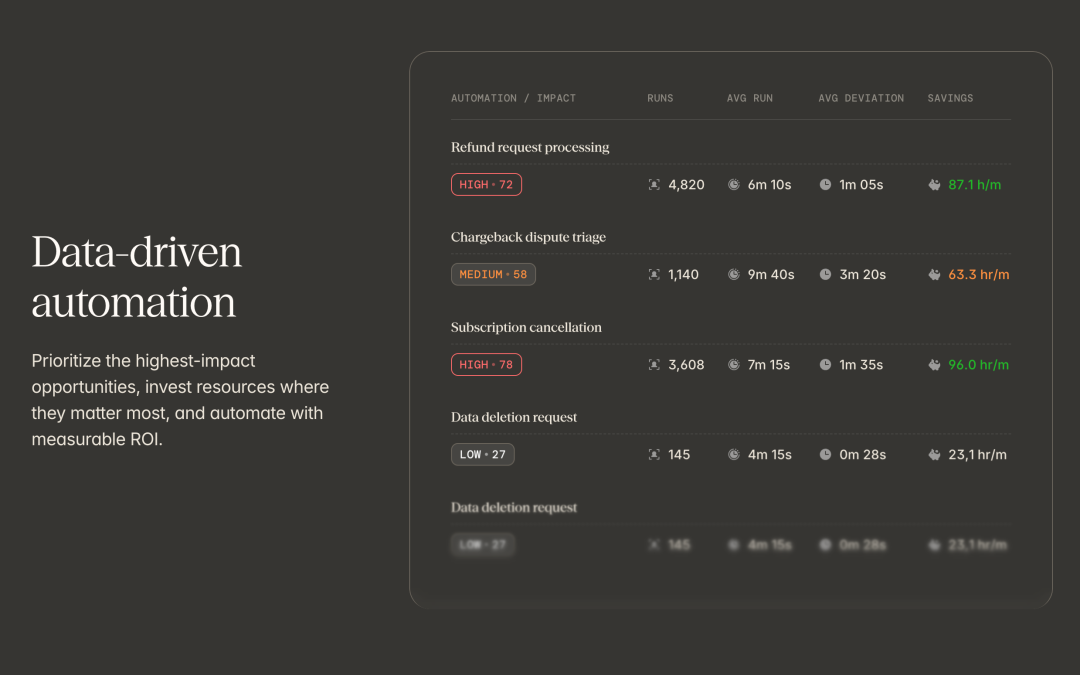 第二件事是决定在哪里应用自动化或AI能产生最大影响。这才是真正的价值所在。很多企业的自动化项目失败,不是因为技术不够好,而是因为选错了自动化对象。他们可能自动化了一个低频发生的流程,或者自动化了一个本身就运转良好的环节,结果投入大量资源却看不到明显效果。而当你有了完整的工作流可见性后,你可以清楚地看到哪些流程重复频繁、耗时长、容易出错,这些才是自动化的最佳候选对象。Reflow甚至会主动推荐自动化机会,帮你确定优先级,告诉你哪些改变能带来最高的投资回报。