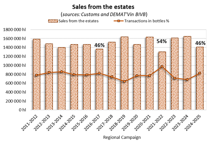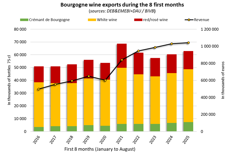 勃艮第对全球市场的出口自2024年以来便趋于恢复,据BIVB数据显示,2025年前8个月勃艮第葡萄酒全球出口量额分别增长4.3%、1.2%。