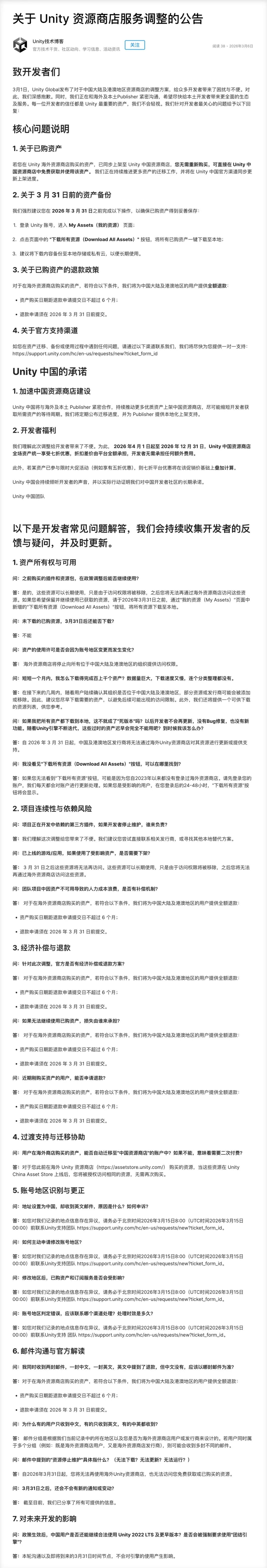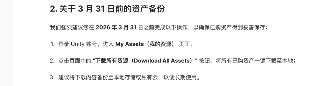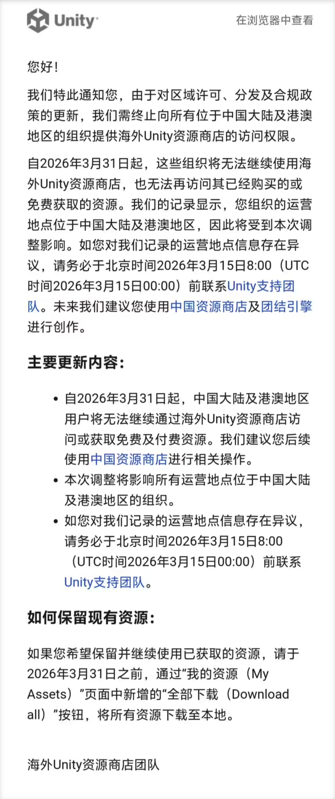 邮件明确,自3月31日起,中国大陆及港澳地区的用户将失去访问海外资源生态的权限。结合此前Unity 6的锁区操作,国内开发者真切地感受到了被物理隔离的阵痛。