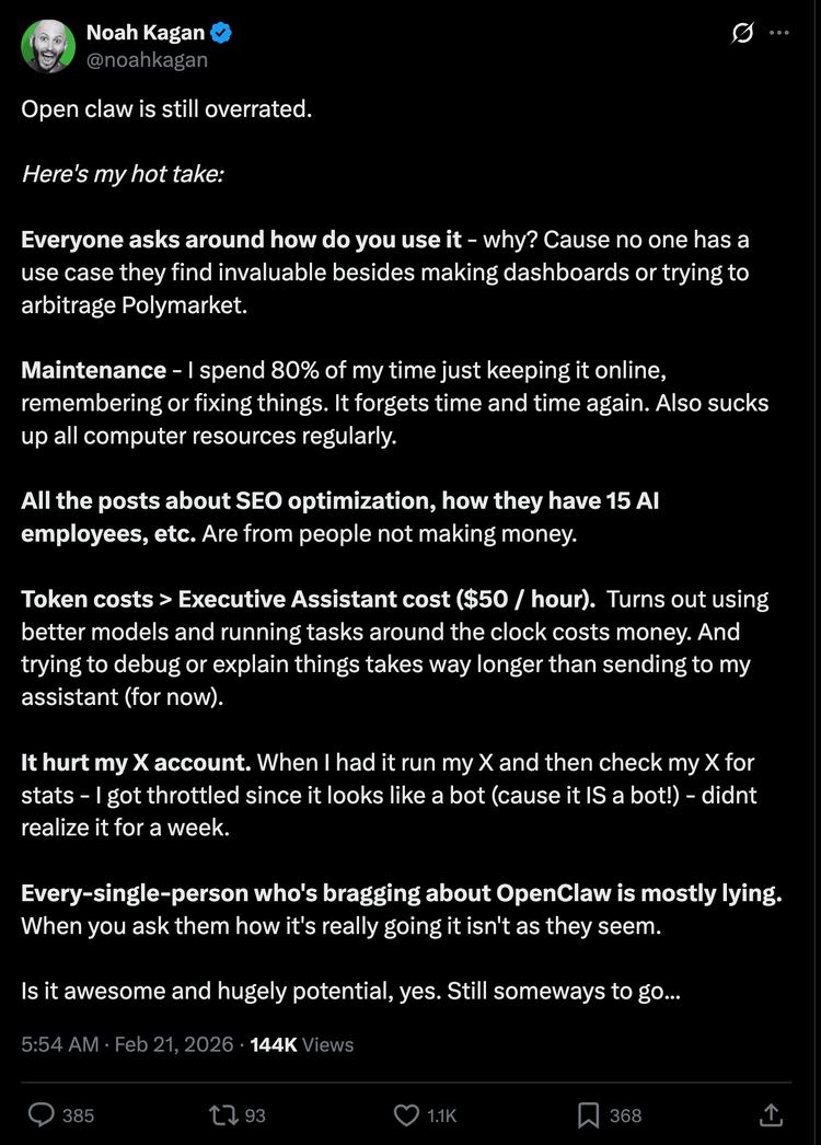 “每个吹嘘OpenClaw的人多半都在撒谎。当你问他们实际使用情况时,真相往往与表面光鲜截然不同。它既惊艳又潜力巨大,确实如此。但仍有提升空间……”