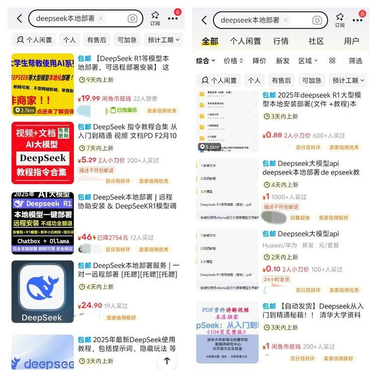 再往回看几个月。2025年春节前后DeepSeek爆火出圈,闲鱼上立刻涌现出从几毛钱到上千元不等的付费内容。有人在闲鱼花0.88元买了一套教程,加了卖家微信,收到一个网盘链接,卖家坦言自己只是靠网盘拉新赚钱,用户每次下载他能拿5块奖励。知识星球上,一个叫“用DeepSeek实战高效赚小钱”的社群4天涌入4000人,按62元一位算,入账近25万。
