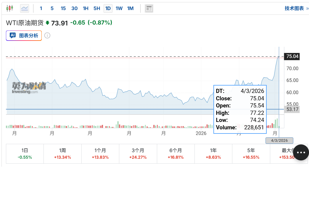 WTI原油期货的价格在2月28日美以袭击之后,也大幅上涨