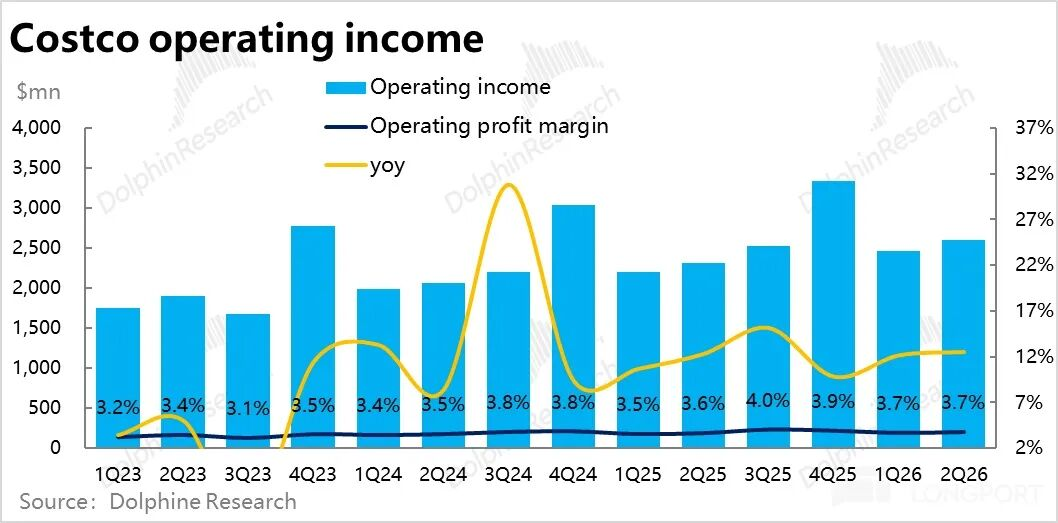 核心经营指标上,Costco本季度整体同店销售增速为7.4%,比上季的6.4%明显提速,也好于市场预期。不过分价量驱动因素来看,同店客流量增速实际环比持平在3.1%,并未提速。主要是靠客单价走高拉动的增长,本季增长4.2%vs.上季的3.2%。