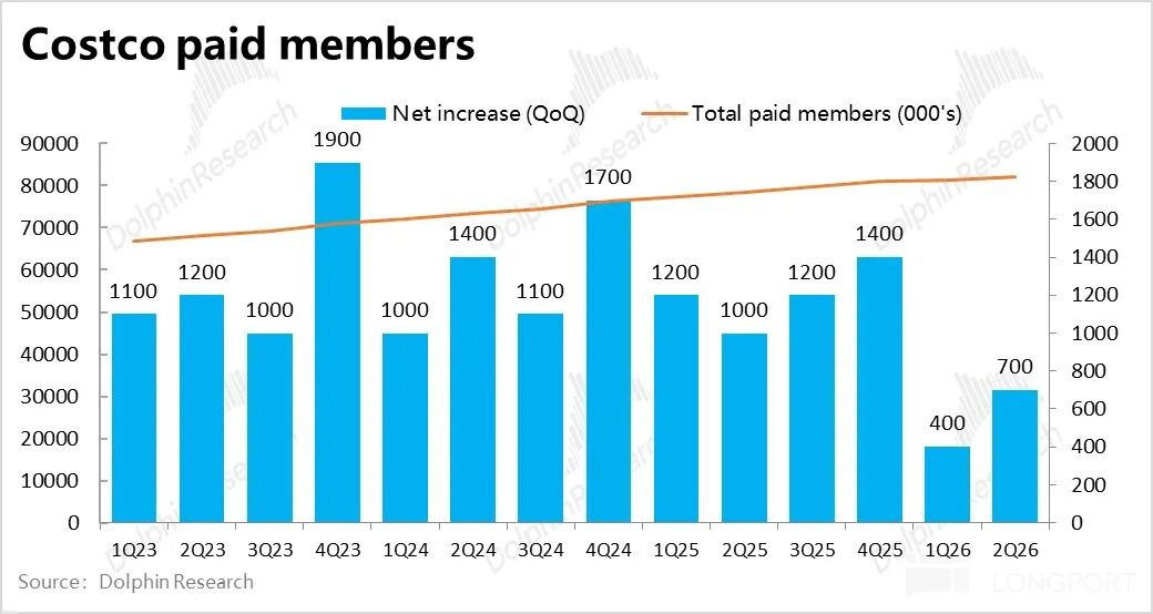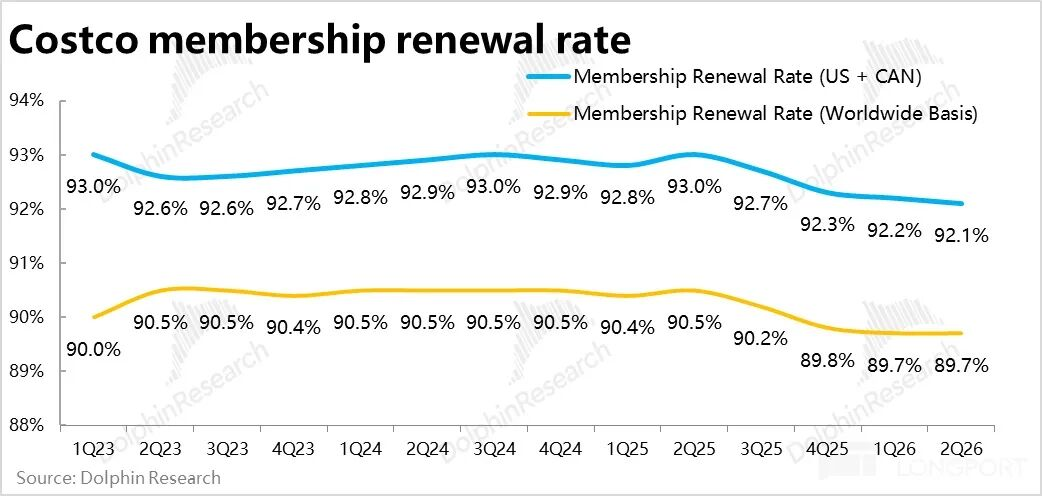 根据公司先前的解释,续费率持续下滑、以及付费会员增长还是偏弱,主要是疫情后,Costco通过线上渠道或者折扣渠道,拓展了大量非Costco核心目标客群的新用户,因此拖累了续费率。
