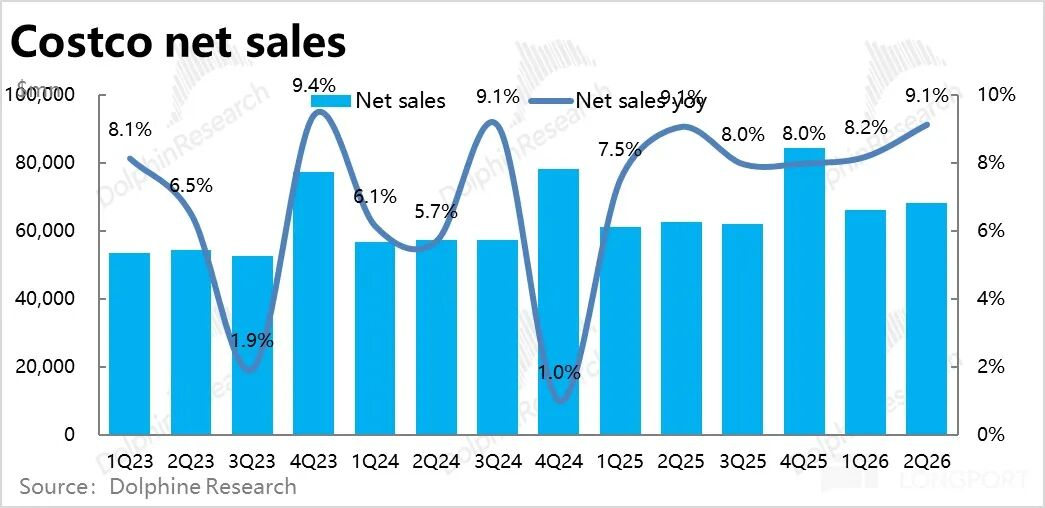 最终整体上,本季Costco商品销售收入同比增长了9.2%,较上季有明显提速,且好于市场预期的8.5%
