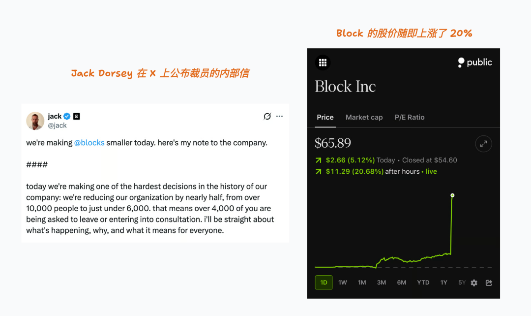企业层面的结构性变化。2 月 26 日,Block 创始人 Jack Dorsey 宣布将公司从 10,000+ 人裁至不到 6,000 人——砍掉超过 40%。他把裁员归因于 AI:“intelligence tools... are enabling a new way of working which fundamentally changes what it means to build and run a company.”市场的反应直截了当:股价当天暴涨 20%。