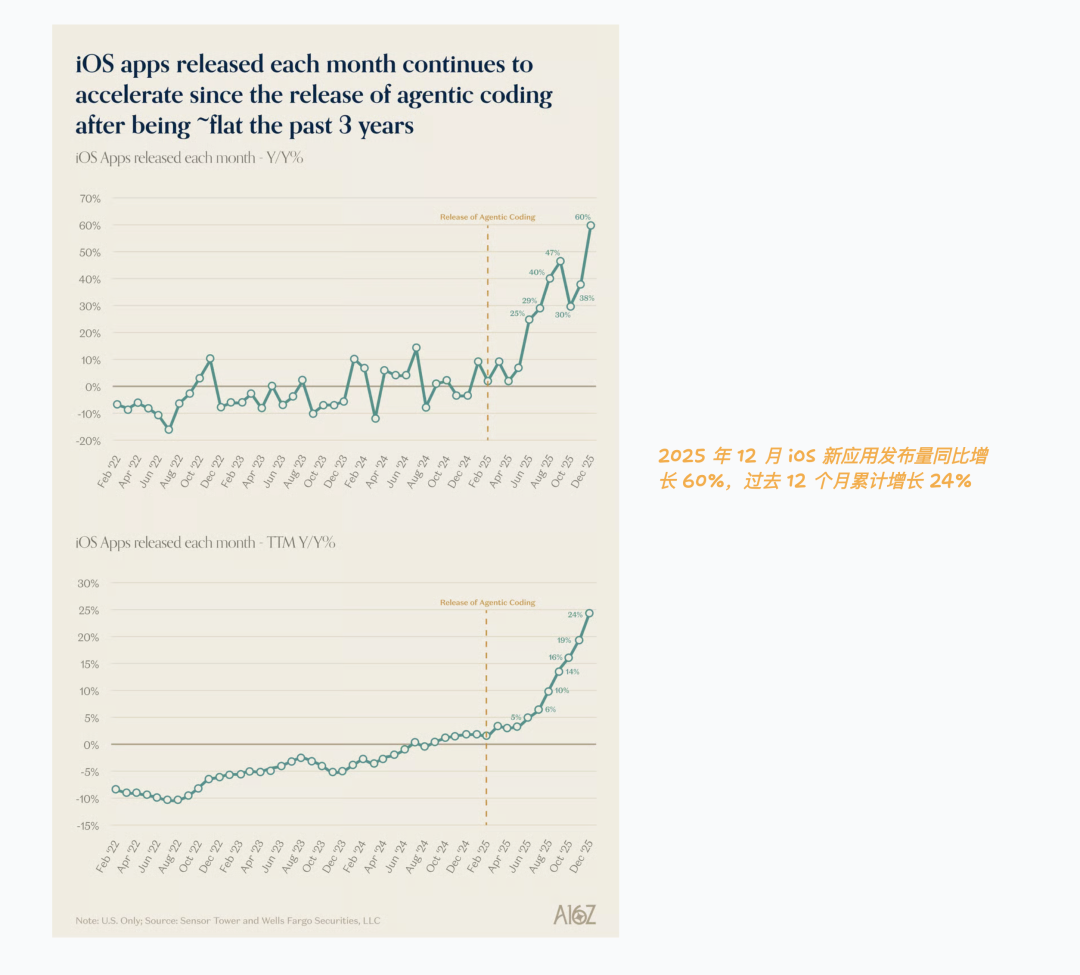 这种供给端爆炸正在当下重演。a16z 的数据显示,2025 年 12 月 iOS 新应用发布量同比增长 60%,过去 12 个月累计增长 24%——他们将这一现象归因于 agentic coding(也叫“vibe coding”)的兴起。这和 2008 年 iPhone SDK 发布后的 app 爆发如出一辙:当创造门槛骤降时,供给端总会爆炸。