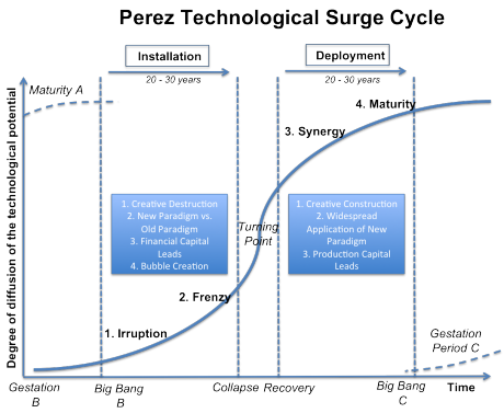 安装期(Installation Period):新技术进入市场,基础设施被建设,金融资本大量涌入,催生投机泡沫,这个阶段的特征是混乱、实验、过度投资。