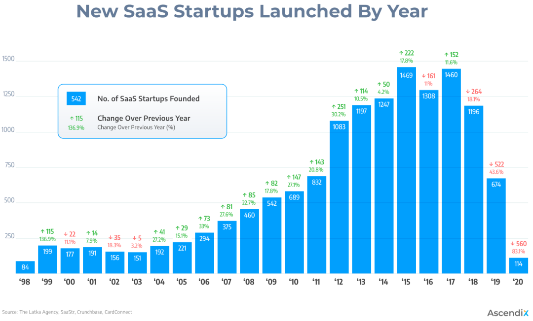 SaaS 市场从 2015 年的 314 亿美元增长到 2024 年的 2,500 亿美元以上,仅美国就有超过 16,500 家 SaaS 公司。但每个垂直领域最终收敛到 2-3 家赢家——又一次幂律分布,和印刷术之后的供给爆炸遵循着同样的规律。价值从“有服务器”迁移到“有用户”,再到“有数据飞轮”和“有网络效应”。