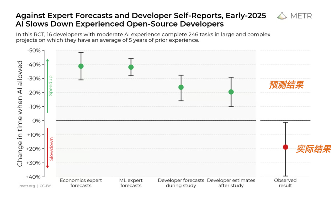 同样的悖论正在 AI coding 领域重演。METR 在 2025 年进行的一项严格随机对照实验发现:当 16 名有经验的开源开发者在自己熟悉的项目(平均维护了 5 年)上使用 AI 工具时,完成任务的时间反而慢了 19%——而实验前,这些开发者预期会快 24%。更大规模的调查显示,75% 的工程师在使用 AI 工具,但大多数组织看不到可衡量的绩效提升。原因是什么?AI 加速了代码生成这一个环节,却在代码审查、集成、测试等环节制造了新的瓶颈——就像在流水线上只加速一台机器,你得到的不是更快的工厂,而是更大的堆积。