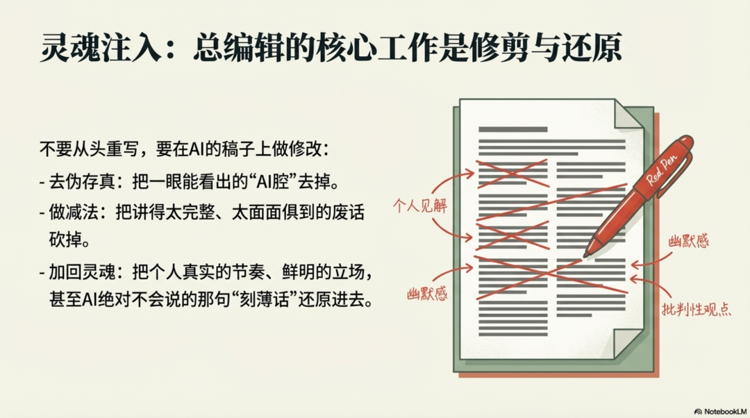 把太正确的表达改成我真实的判断,把太完整的结构砍掉不必要的部分,把AI绝对不会说的那句刻薄话加回去。