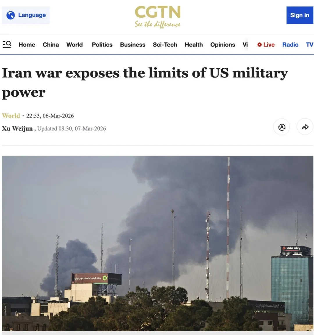 3月6日,CGTN刊登IPP副研究员徐伟钧的文章。文章指出,本轮冲突的演进取决于美伊双方弹药库存与产能博弈,若伊朗持续用低成本武器消耗美军拦截弹库存,将迫使美军按威胁等级拦截、收缩防护范围甚至放弃非核心目标。他指出,美国摧毁伊朗核能力、推动政权更迭、提振选情等战略目标均难以通过远程打击实现,维持长期战争的高额代价可能会重塑特朗普政府的对伊打击意愿,推动其转向以"叙事层面的胜利"终止本轮军事行动。