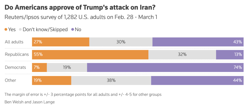 [1]Jason Lange,“Just one in four Americans say they back US strikes on Iran,Reuters/Ipsos poll finds,”Reuters,March 1,2026,https://www.reuters.com/world/us/just-one-four-americans-support-us-strikes-iran-reutersipsos-poll-finds-2026-03-01/.