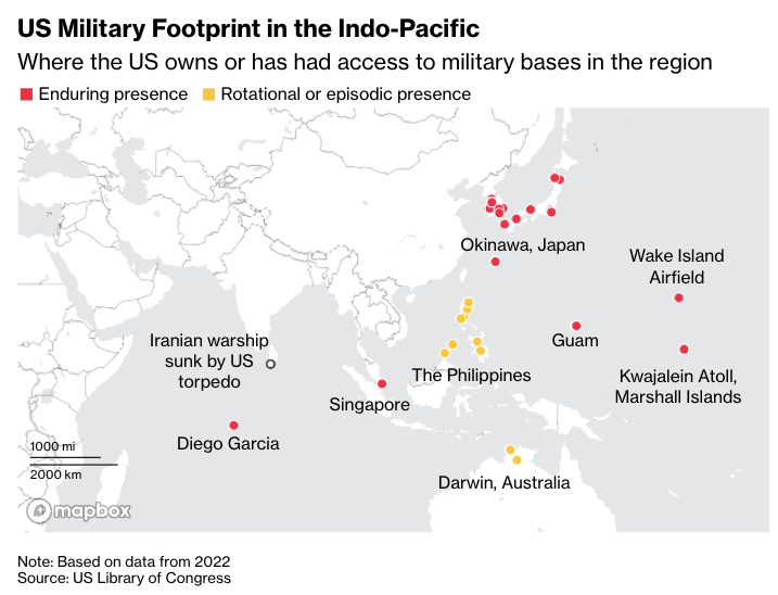 图为美国在印太地区的军事存在。信息来源:US Library of Congress图源:BBC