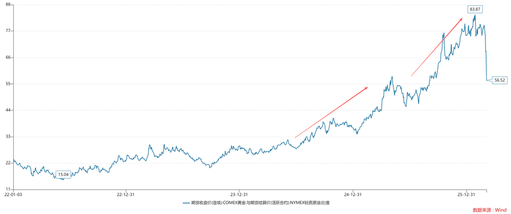 如上图所示,金油比在2023年突破30大关,之后一发不可收拾,攀升到84的高位。直到最近,油价才大幅上涨,金油比快速收敛至56。